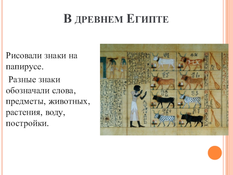 В ДРЕВНЕМ ЕГИПТЕРисовали знаки на папирусе. Разные знаки обозначали слова, предметы, животных, растения, воду, постройки.