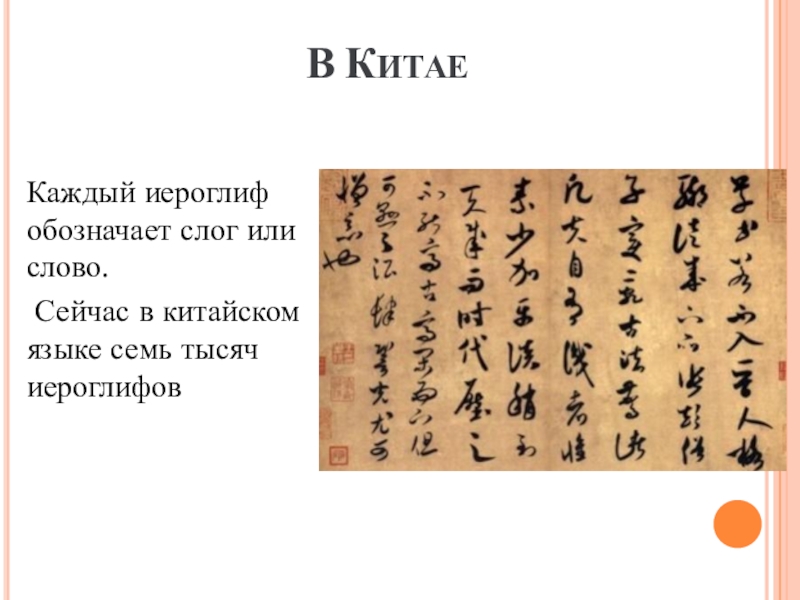 В КИТАЕ 	Каждый иероглиф обозначает слог или слово. Сейчас в китайском языке семь тысяч иероглифов