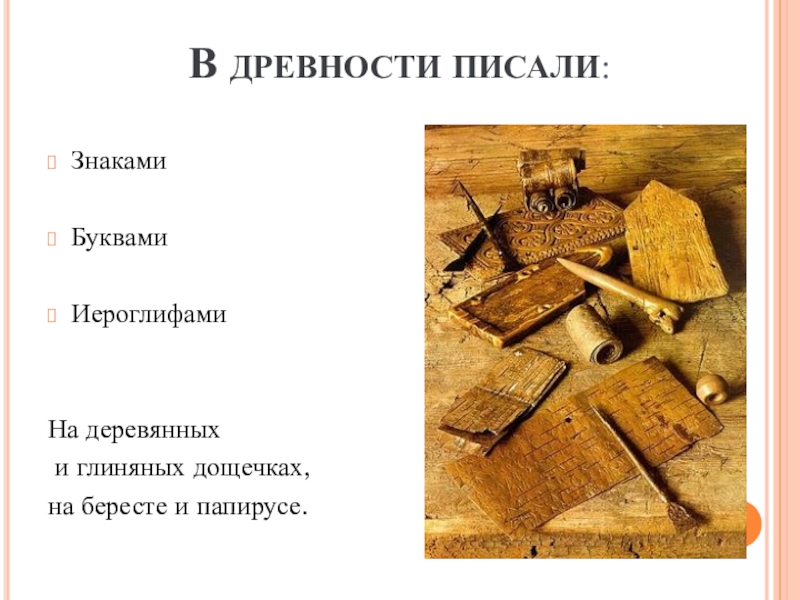 В ДРЕВНОСТИ ПИСАЛИ:ЗнакамиБуквамиИероглифамиНа деревянных и глиняных дощечках, на бересте и папирусе.