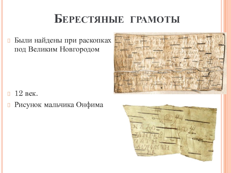 БЕРЕСТЯНЫЕ ГРАМОТЫБыли найдены при раскопках под Великим Новгородом12 век.Рисунок мальчика Онфима