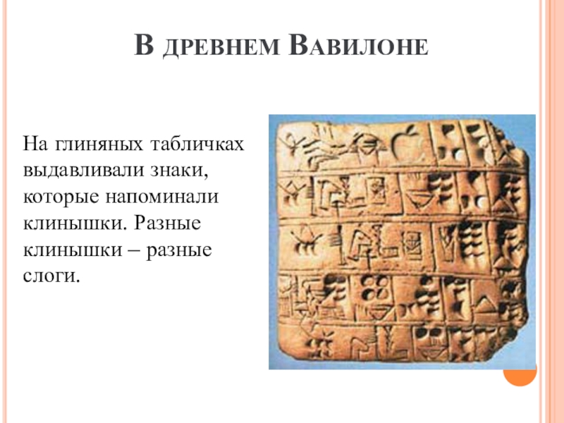 В ДРЕВНЕМ ВАВИЛОНЕНа глиняных табличках выдавливали знаки, которые напоминали клинышки. Разные клинышки – разные слоги.