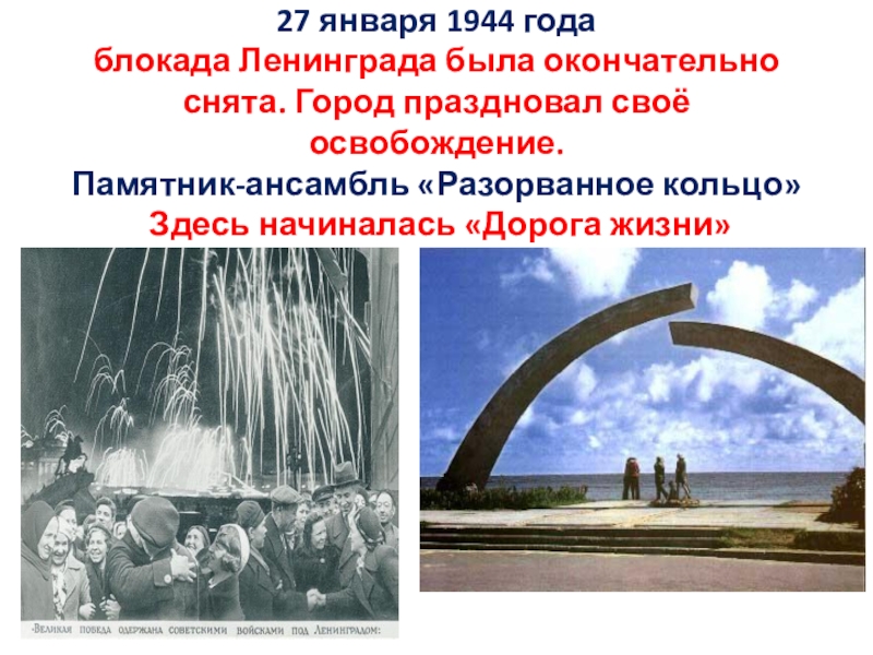 27 января 1944 года блокада Ленинграда была окончательно снята. Город праздновал своё освобождение. Памятник-ансамбль «Разорванное кольцо»
