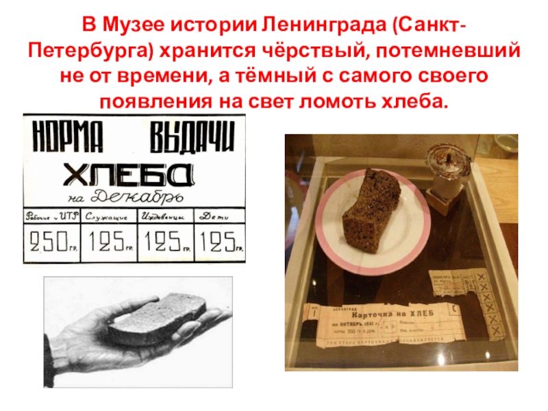 В Музее истории Ленинграда (Санкт-Петербурга) хранится чёрствый, потемневший не от времени, а тёмный с самого своего появления на свет ломоть хлеба.