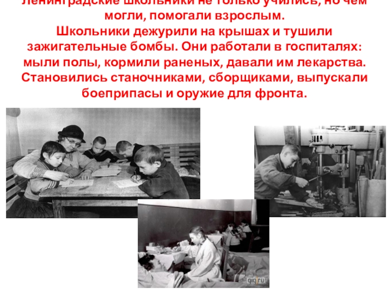 Слайд 4Ленинградские школьники не только учились, но чем могли, помогали взрослым. Школьники дежурили