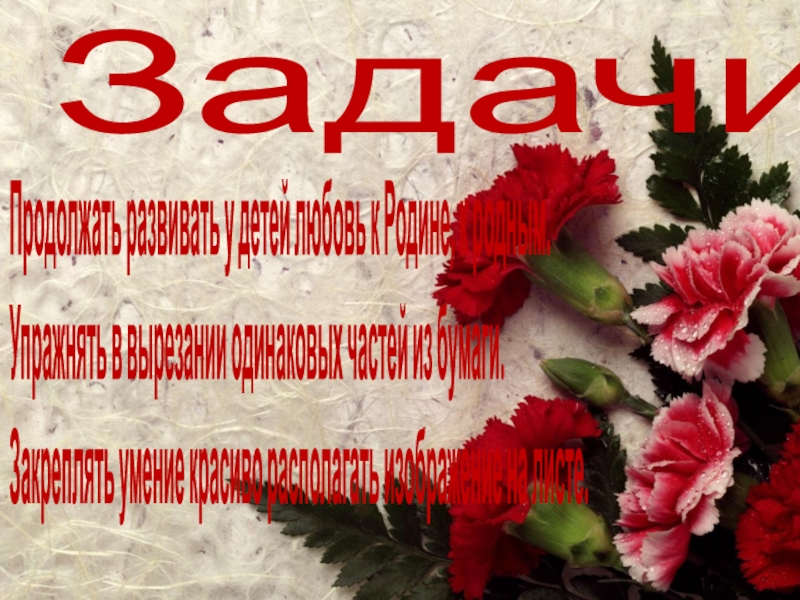 ЗадачиПродолжать развивать у детей любовь к Родине, к родным.Упражнять в вырезании одинаковых частей из бумаги.Закреплять умение красиво располагать изображение на листе.