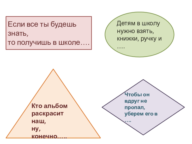 Если все ты будешь знать,то получишь в школе….Детям в школу нужно взять,книжки, ручку и …. Кто альбом раскрасит наш,ну, конечно…..Чтобы он вдруг не пропал,уберем его в ….