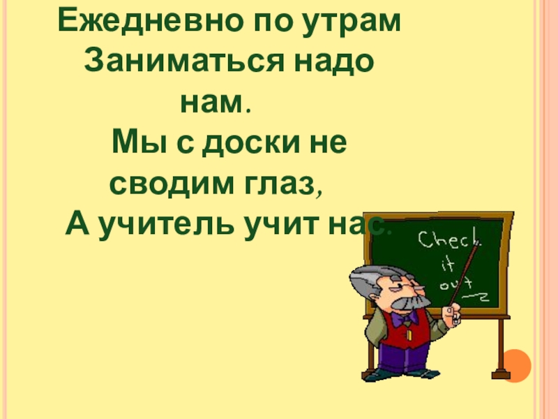 Ежедневно по утрам Заниматься надо нам.Мы с доски не сводим глаз,А учитель учит нас.