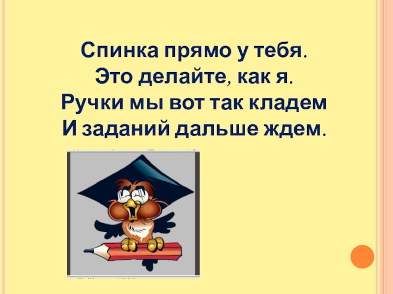 Спинка прямо у тебя.Это делайте, как я.Ручки мы вот так кладемИ заданий дальше ждем.