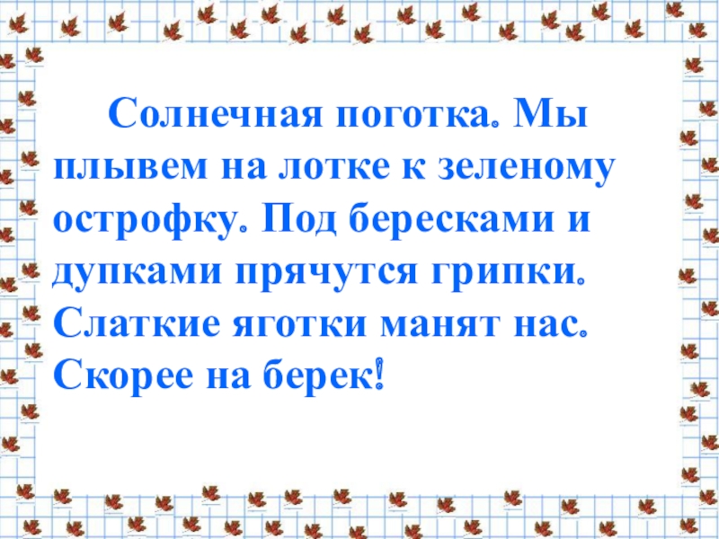 Солнечная поготка. Мы плывем на лотке к зеленому острофку. Под бересками и дупками прячутся грипки. Слаткие яготки манят нас. Скорее на берек!