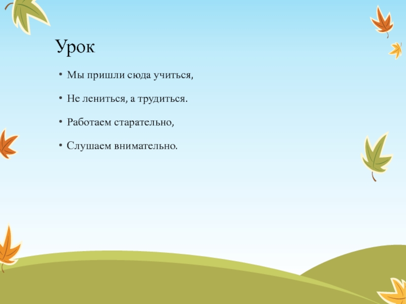 УрокМы пришли сюда учиться,Не лениться, а трудиться.Работаем старательно,Слушаем внимательно.