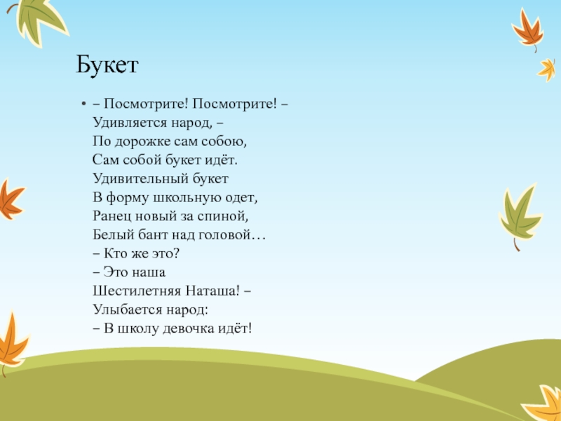идёт. Удивительный букет В форму школьную одет, Ранец новый за спиной, Белый бант над головой… – Кто же это? – Это наша Шестилетняя Наташа! – Улыбается народ: – В школу девочка идёт!
