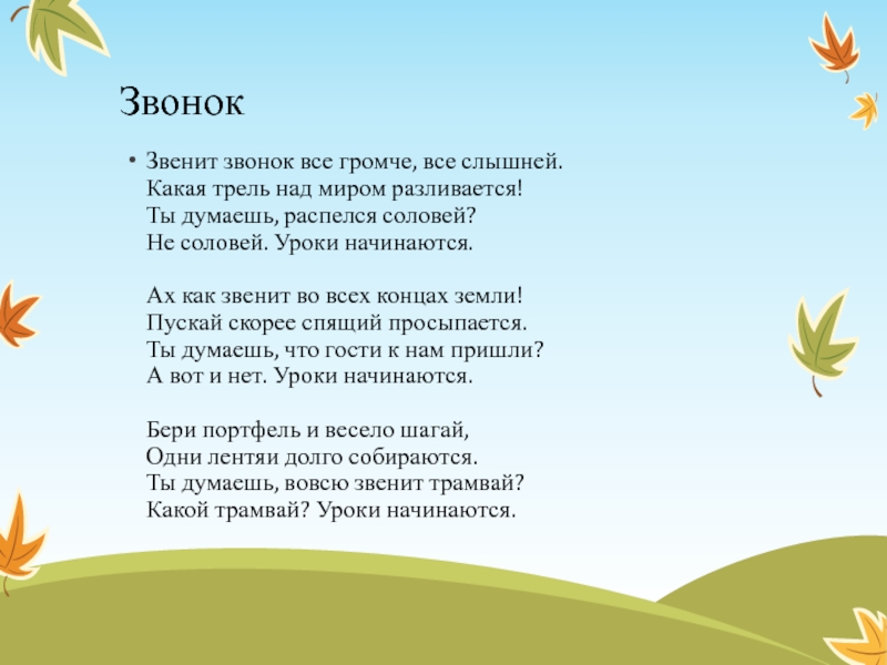 ЗвонокЗвенит звонок все громче, все слышней. Какая трель над миром разливается! Ты думаешь, распелся соловей? Не соловей. Уроки начинаются. Ах как звенит во всех концах земли! Пускай скорее спящий просыпается. Ты думаешь, что гости к
