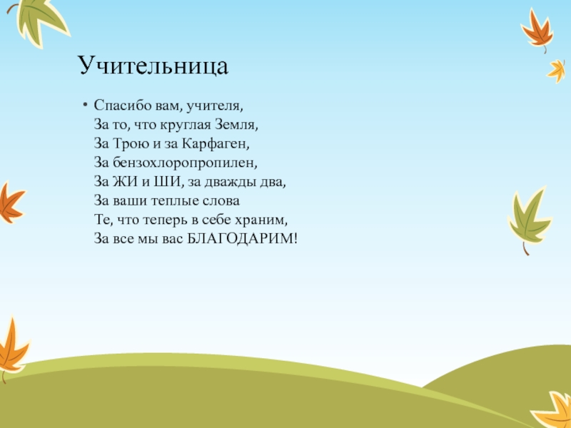 УчительницаСпасибо вам, учителя, За то, что круглая Земля, За Трою и за Карфаген, За бензохлоропропилен, За ЖИ