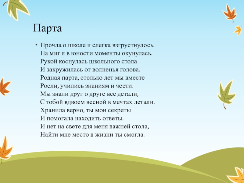 окунулась. Рукой коснулась школьного стола И закружилась от волненья голова. Родная парта, столько лет мы вместе Росли, учились знаниям и чести. Мы знали друг о друге все детали, С тобой вдвоем весной в мечтах летали. Хранила верно, ты мои секреты И помогала находить ответы. И нет на свете для меня важней стола, Найти мне место в жизни ты смогла.