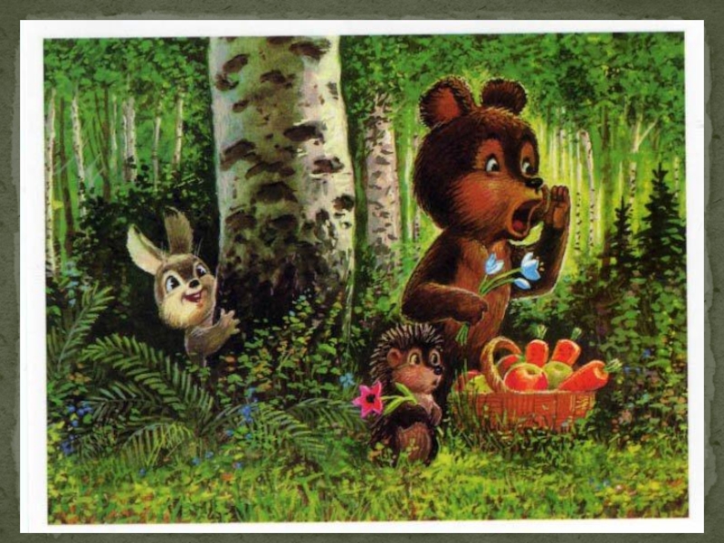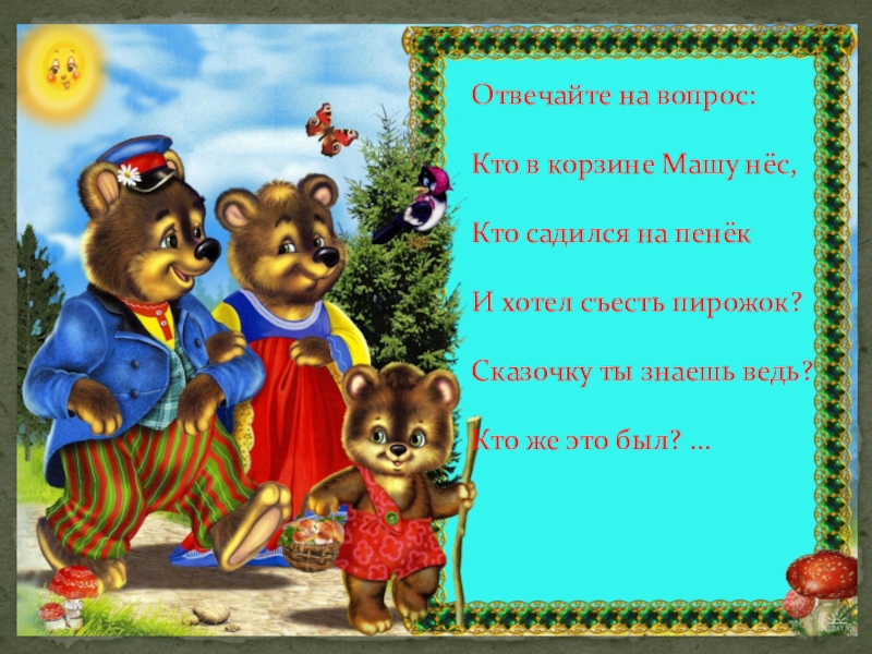 Отвечайте на вопрос:Кто в корзине Машу нёс,Кто садился на пенёкИ хотел съесть пирожок?Сказочку ты знаешь ведь?Кто же