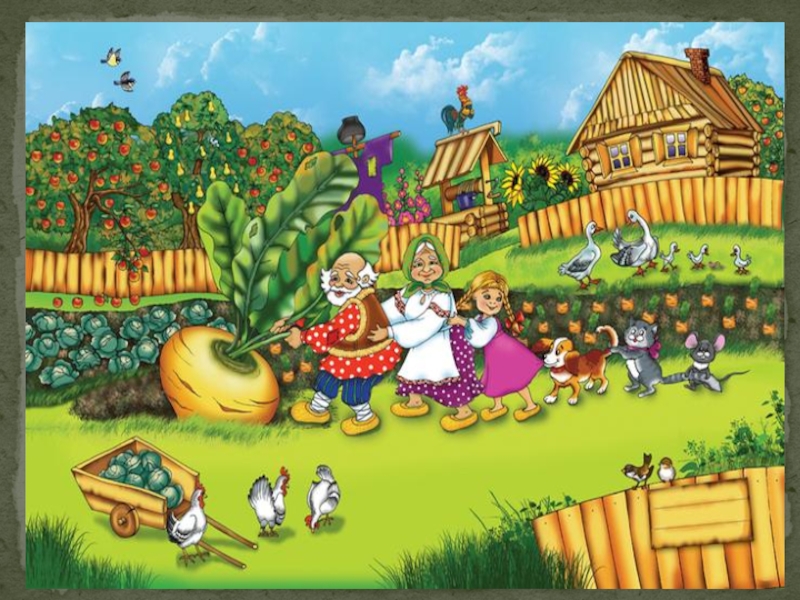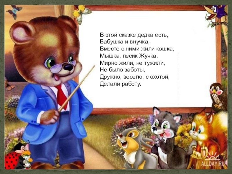 В этой сказке дедка есть,В этой сказке дедка есть,Бабушка и внучка,Вместе с ними жили кошка,Мышка, песик Жучка.Мирно жили, не тужили,Не было заботы,Дружно, весело, с охотой,Делали работу.