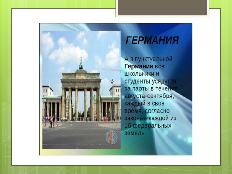 мира принято отмечать начало учебного года в разные числа. Например, в Германии учебный год начинается в конце августа-в начале сентября. В столице Германии -Берлине учебный год начинается с 21 августа. А в девяти странах с которыми граничит Германия учебный год начинается в конце июля-в начале сентября. Страна Германия состоит из федеративных земель, а Канада – из провинций, и каждая провинция, или земля – как маленькое государство – сама назначает себе начало учебного года.