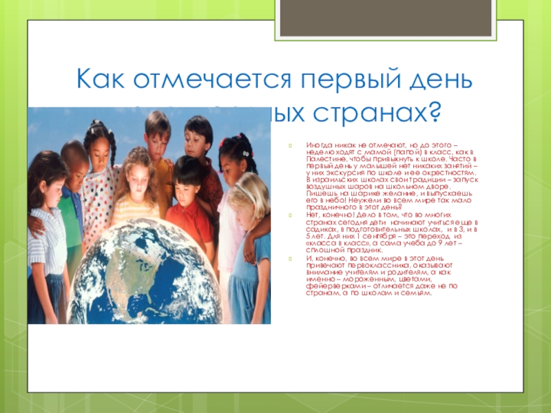 Слайд 5 Как отмечается первый день в школе в разных странах?