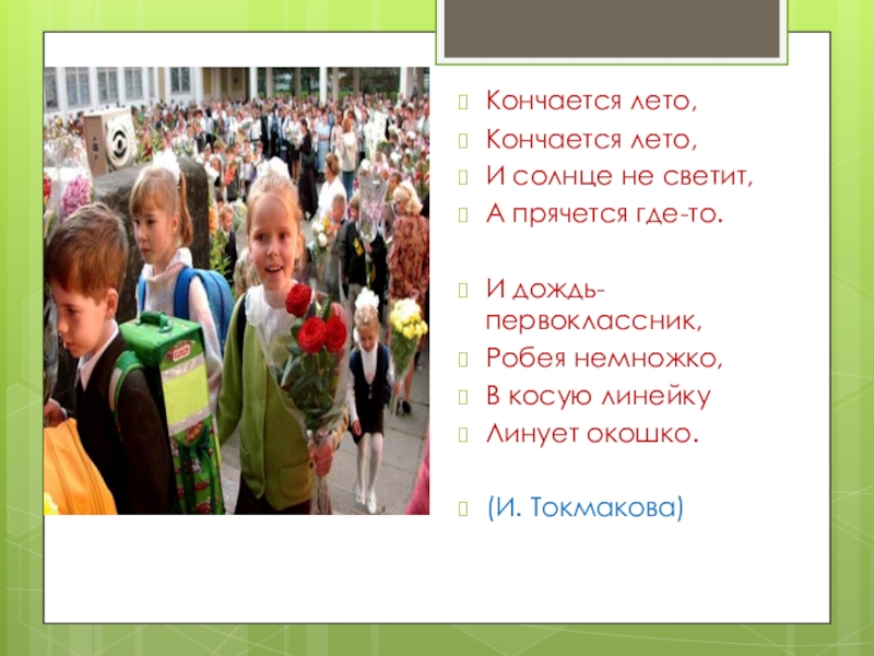 Кончается лето,Кончается лето,И солнце не светит,А прячется где-то.И дождь-первоклассник,Робея немножко,В косую линейкуЛинует окошко.(И. Токмакова)
