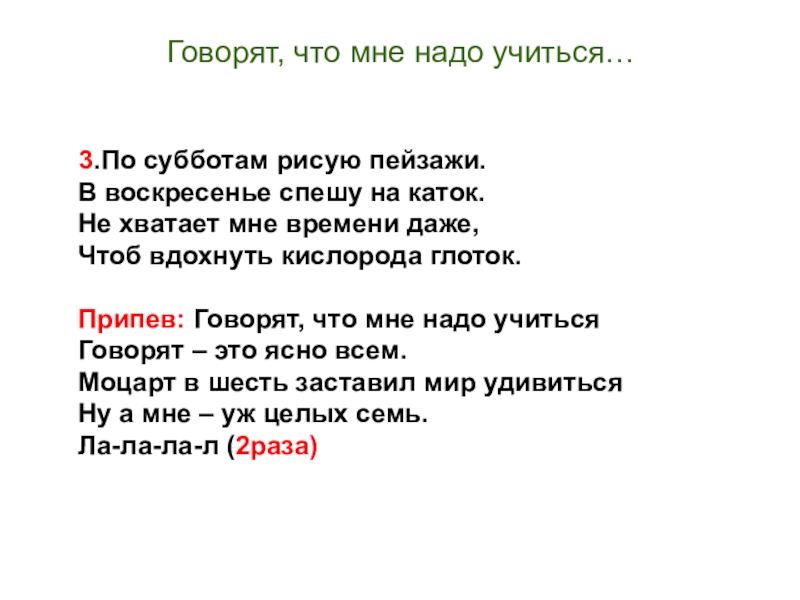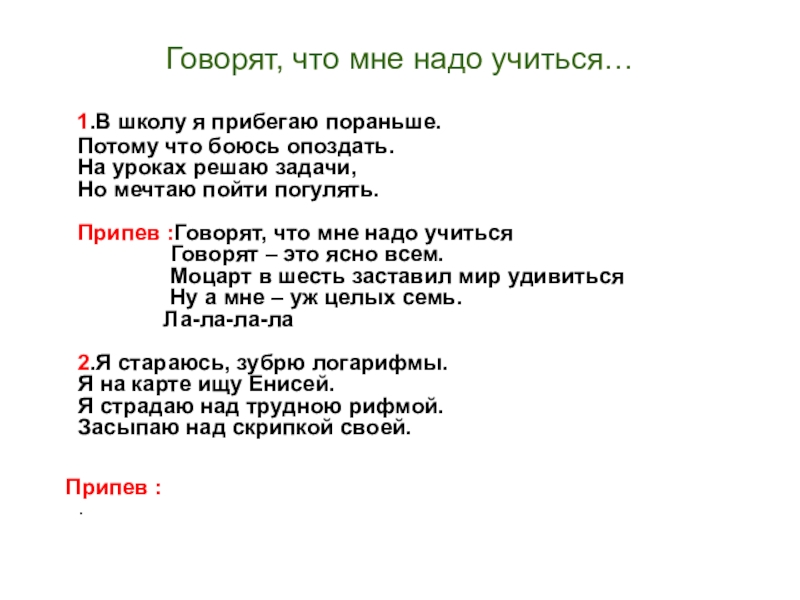 что боюсь опоздать. На уроках решаю задачи, Но мечтаю пойти погулять. Припев :Говорят, что мне надо учиться Говорят – это ясно всем. Моцарт в шесть заставил мир удивиться Ну а мне – уж целых семь. Ла-ла-ла-ла 2.Я стараюсь, зубрю логарифмы. Я на карте ищу Енисей. Я страдаю над трудною рифмой. Засыпаю над скрипкой своей.