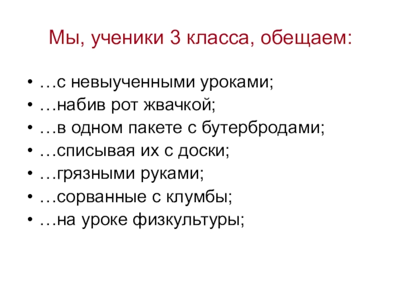 Мы, ученики 3 класса, обещаем:…с невыученными уроками;…набив рот жвачкой;…в одном пакете с бутербродами;…списывая их с доски;…грязными руками;…сорванные