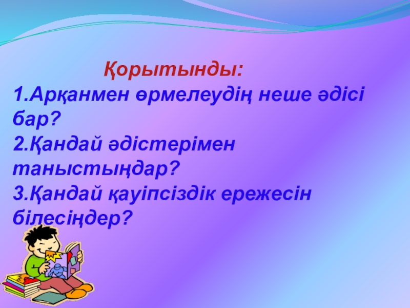 Қорытынды:1.Арқанмен өрмелеудің неше әдісі бар?2.Қандай әдістерімен таныстыңдар?3.Қандай қауіпсіздік ережесін