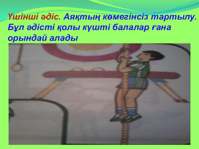 Слайд 8Үшінші әдіс. Аяқтың көмегінсіз тартылу. Бұл әдісті қолы күшті балалар ғана