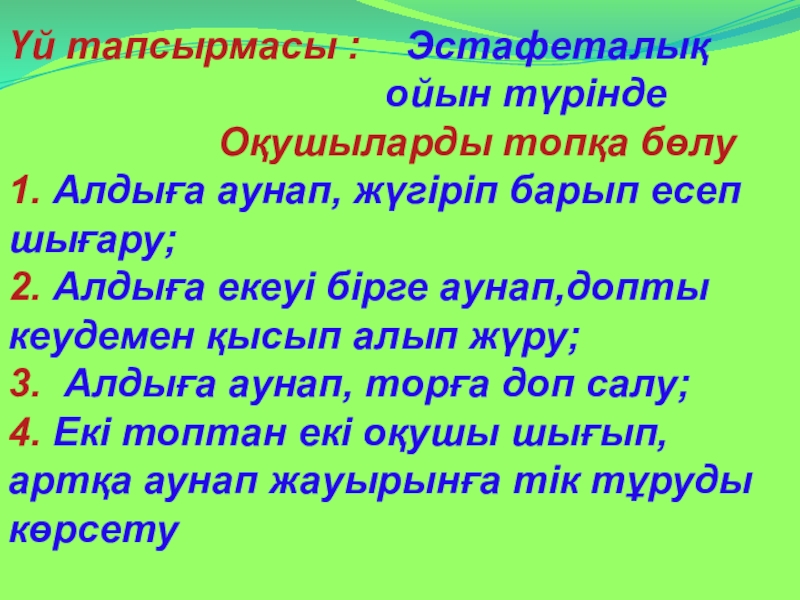 Слайд 4Үй тапсырмасы : Эстафеталық