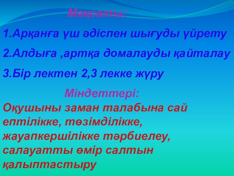 Мақсаты:1.Арқанға үш әдіспен шығуды үйрету2.Алдыға ,артқа домалауды қайталау3.Бір лектен 2,3 лекке жүру Міндеттері: