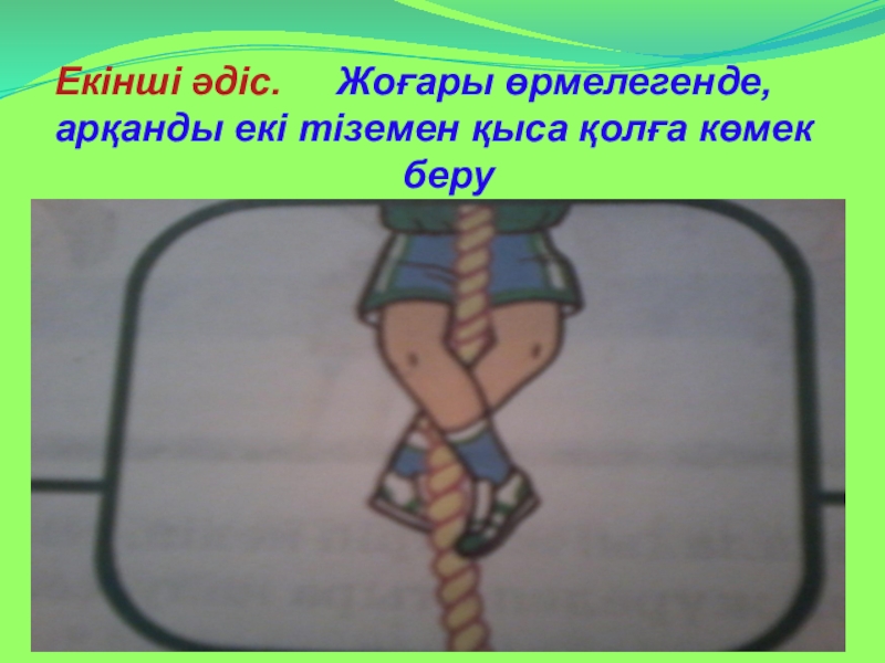 Слайд 7Екінші әдіс. Жоғары өрмелегенде, арқанды екі тіземен қыса қолға