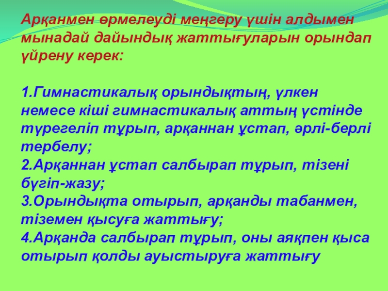 Арқанмен өрмелеуді меңгеру үшін алдымен мынадай дайындық жаттығуларын орындап үйрену керек: