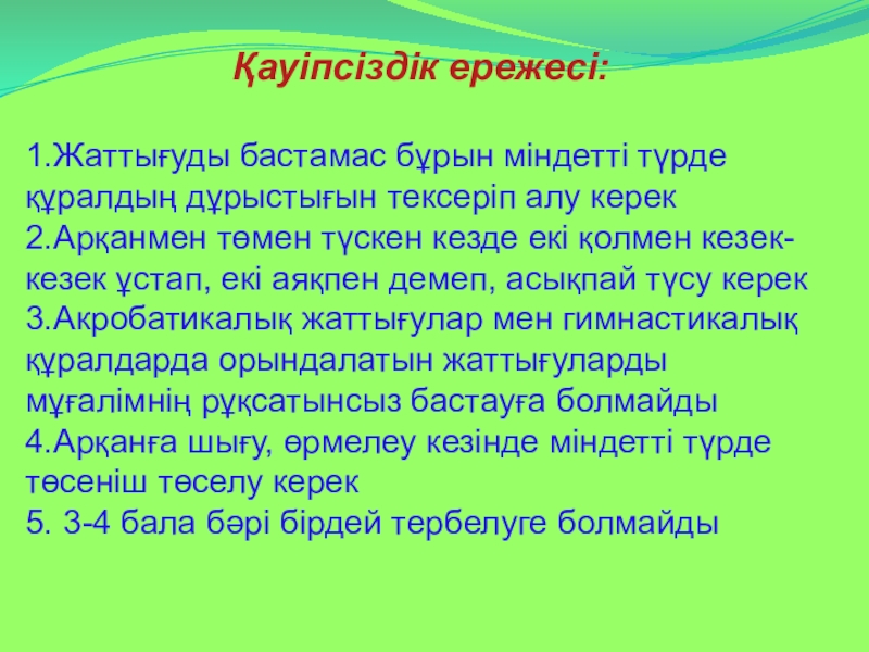 3.Акробатикалық жаттығулар мен гимнастикалық құралдарда орындалатын жаттығуларды мұғалімнің рұқсатынсыз бастауға болмайды