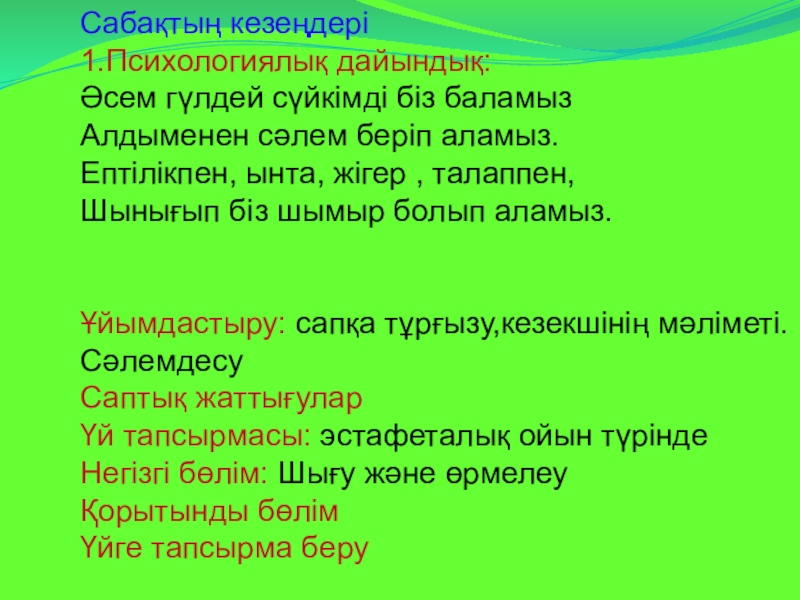 Сабақтың кезеңдері1.Психологиялық дайындық:Әсем гүлдей сүйкімді біз баламызАлдыменен сәлем беріп аламыз.Ептілікпен, ынта, жігер , талаппен,Шынығып біз шымыр болып