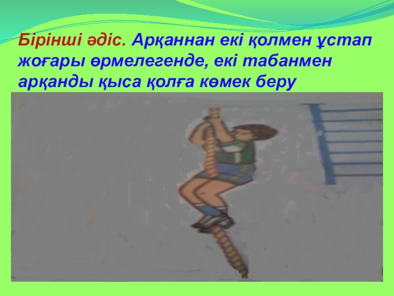 Слайд 6Бірінші әдіс. Арқаннан екі қолмен ұстап жоғары өрмелегенде, екі табанмен арқанды