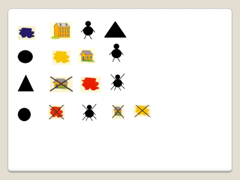 6. Педагог қатарда алты түрлі пішіндерді жайғастырады. Баланың міндеті, пішіндер астында қарама – қарсы пішіндер жатқандай етіп, төменгі қатарды қалыптастыру керек . Олар түсімен, көлемімен немесе нысандарымен айырмашылықта болуы мүмкін.