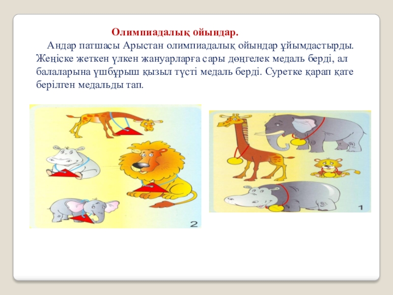 Андар патшасы Арыстан олимпиадалық ойындар ұйымдастырды. Жеңіске жеткен үлкен жануарларға сары дөңгелек медаль берді, ал балаларына үшбұрыш қызыл түсті медаль берді. Суретке қарап қате берілген медальды тап.