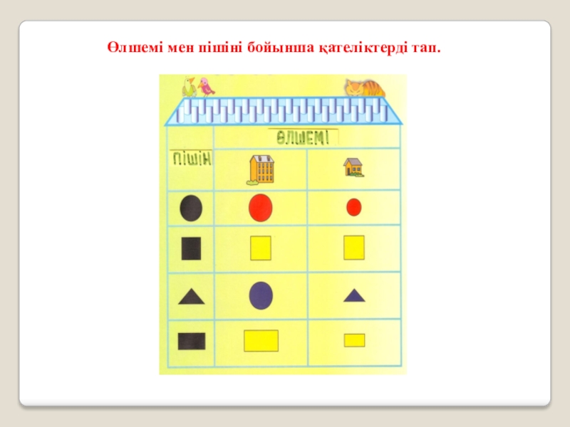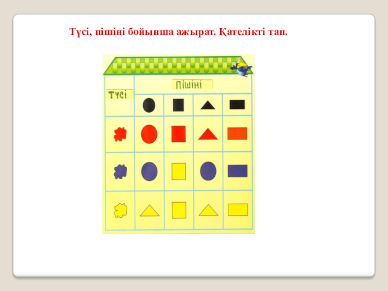 Слайд 13 Түсі, пішіні бойынша ажырат. Қателікті тап.
