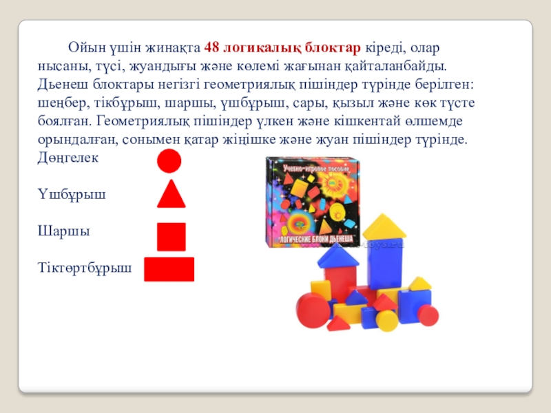 Слайд 6 Ойын үшін жинақта 48 логикалық блоктар кіреді,
