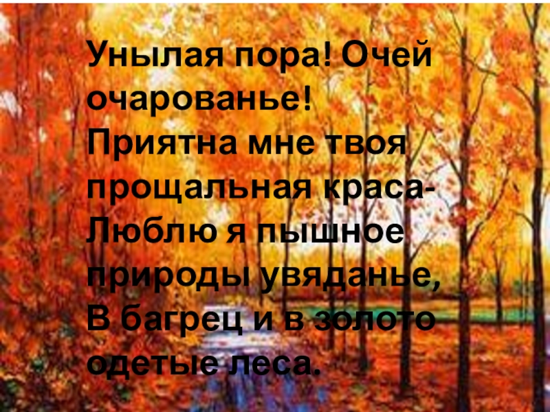 Унылая пора! Очей очарованье!Приятна мне твоя прощальная краса-Люблю я пышное природы увяданье,В багрец и в золото одетые леса.