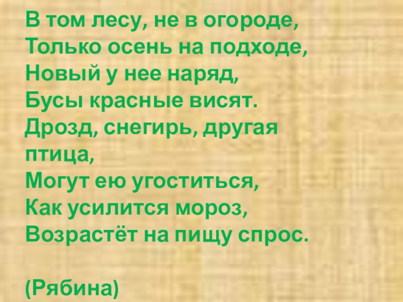 В том лесу, не в огороде, Только осень на подходе, Новый у нее наряд, Бусы красные висят.