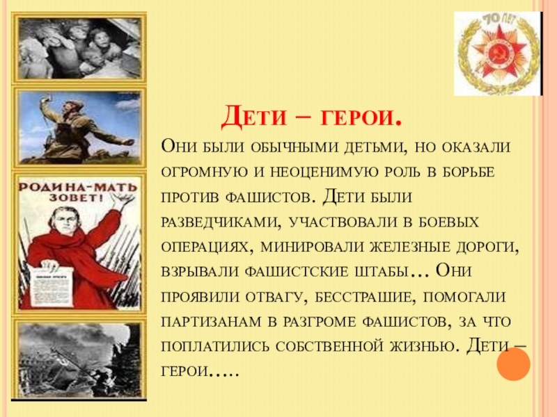 Дети – герои. Они были обычными детьми, но оказали огромную и неоценимую роль в борьбе против фашистов. Дети были разведчиками, участвовали в боевых операциях, минировали железные дороги,