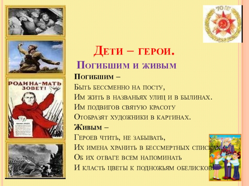 Дети – герои.  Погибшим и живым Погибшим – Быть бессменно на посту, Им