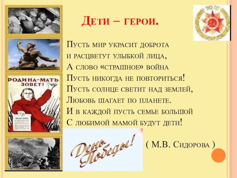 слово «страшное» война Пусть никогда не повториться! Пусть солнце светит над землей, Любовь шагает по планете. И в каждой пусть семье большой С любимой мамой будут дети! ( М.В. Сидорова )