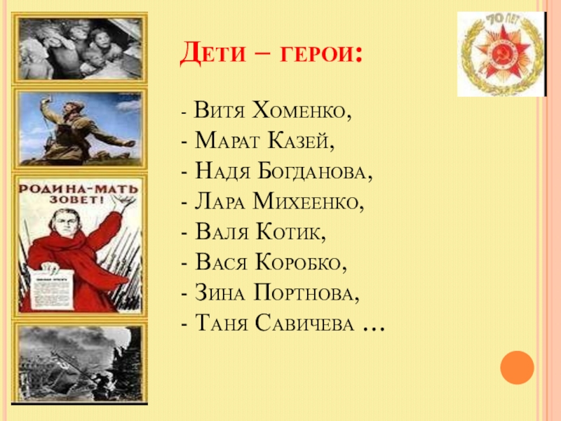 Дети – герои:  - Витя Хоменко, - Марат Казей, - Надя Богданова, - Лара Михеенко, -