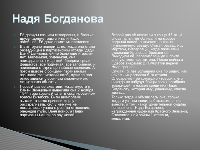 Спустя 15 лет услышала она по радио, как начальник разведки 6-го отряда Слесаренко - её командир - говорил, что никогда не забудут бойцы своих погибших товарищей, и назвал среди них Надю Богданову, которая ему, раненому, спасла жизнь...