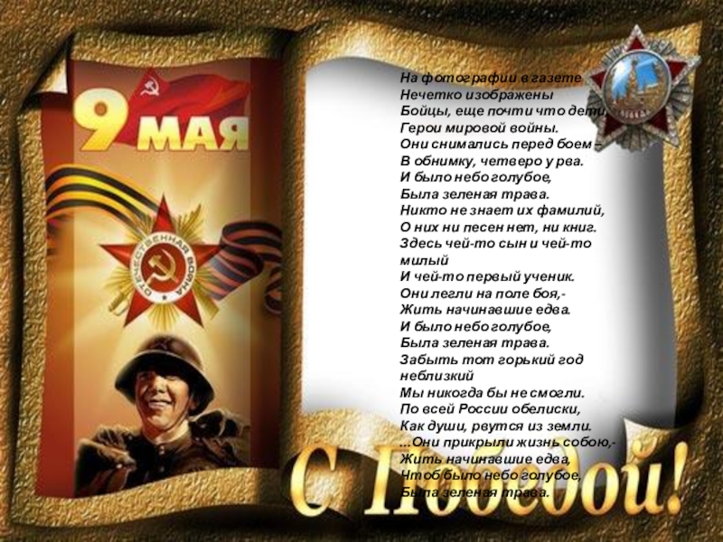в сорок третьем Выдали медали. И только в сорок пятом -  Паспорта. И в этом нет беды... Но взрослым людям, Уже прожившим многие года, Вдруг страшно оттого, Что мы не будем Ни старше, ни взрослее, Чем тогда...»