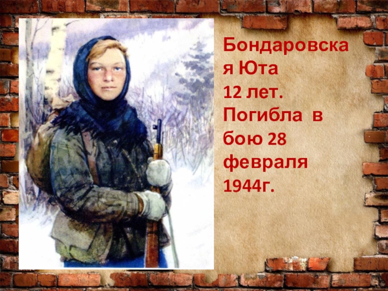 Бондаровская Юта 12 лет.Погибла в бою 28 февраля 1944г.