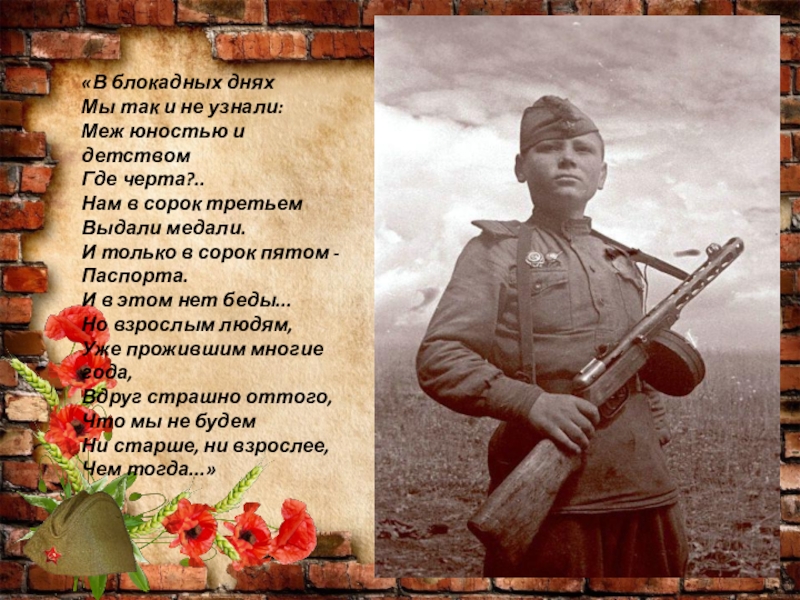 «В блокадных днях Мы так и не узнали: Меж юностью и детством Где черта?.. Нам в сорок