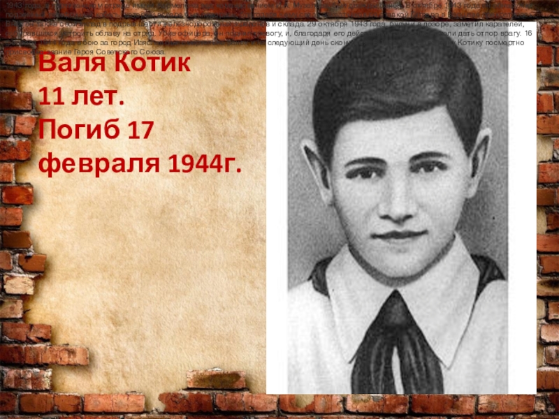 Валя Котик 11 лет.Погиб 17 февраля 1944г.К началу войны он только перешёл в шестой класс, но с