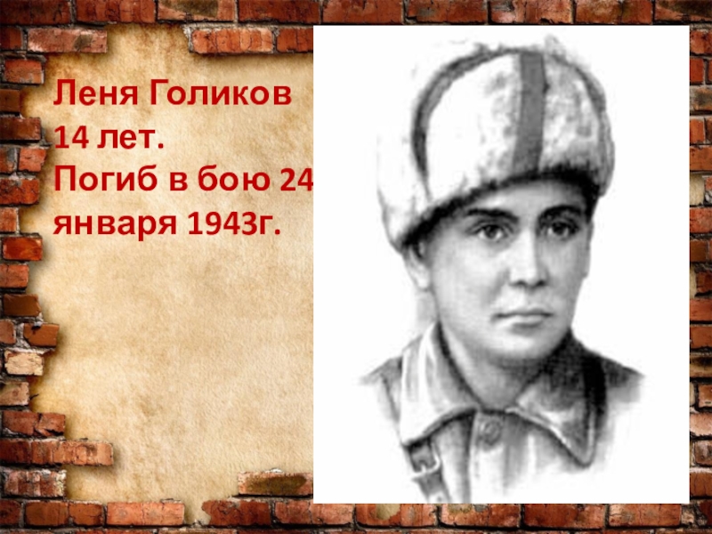 Леня Голиков 14 лет.Погиб в бою 24 января 1943г.